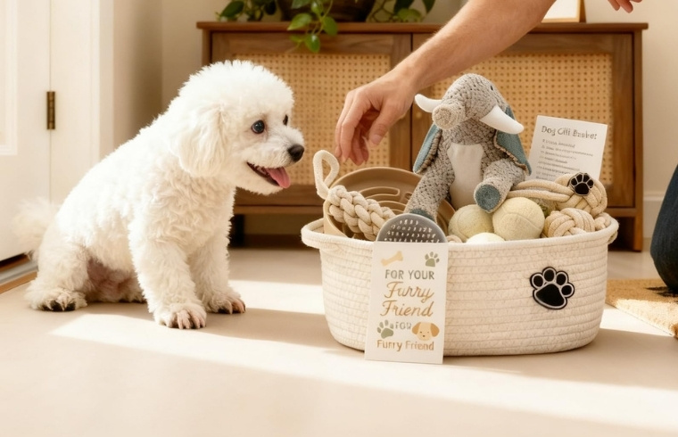 A tidy cotton rope basket packed with chew toys, fetch balls, and puppy must-haves for a new small pup.