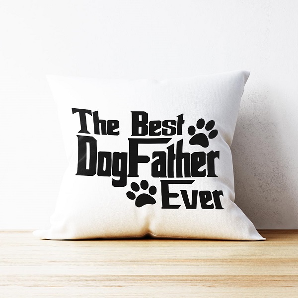 Upgrade his favorite spot on the couch with a themed throw pillow. This cover uses a durable and eco-friendly cotton linen blend. The bold black lettering proudly claims his dog dad title.
